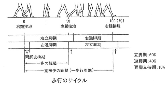 ウォーキングは、足が地面に設置した時から、同じ足の次の設置まで分解すると以下のように図解できる。これらを知っておくこともウォーキングを実践していくうえで役立つこともあるので参考にしていただきたい。